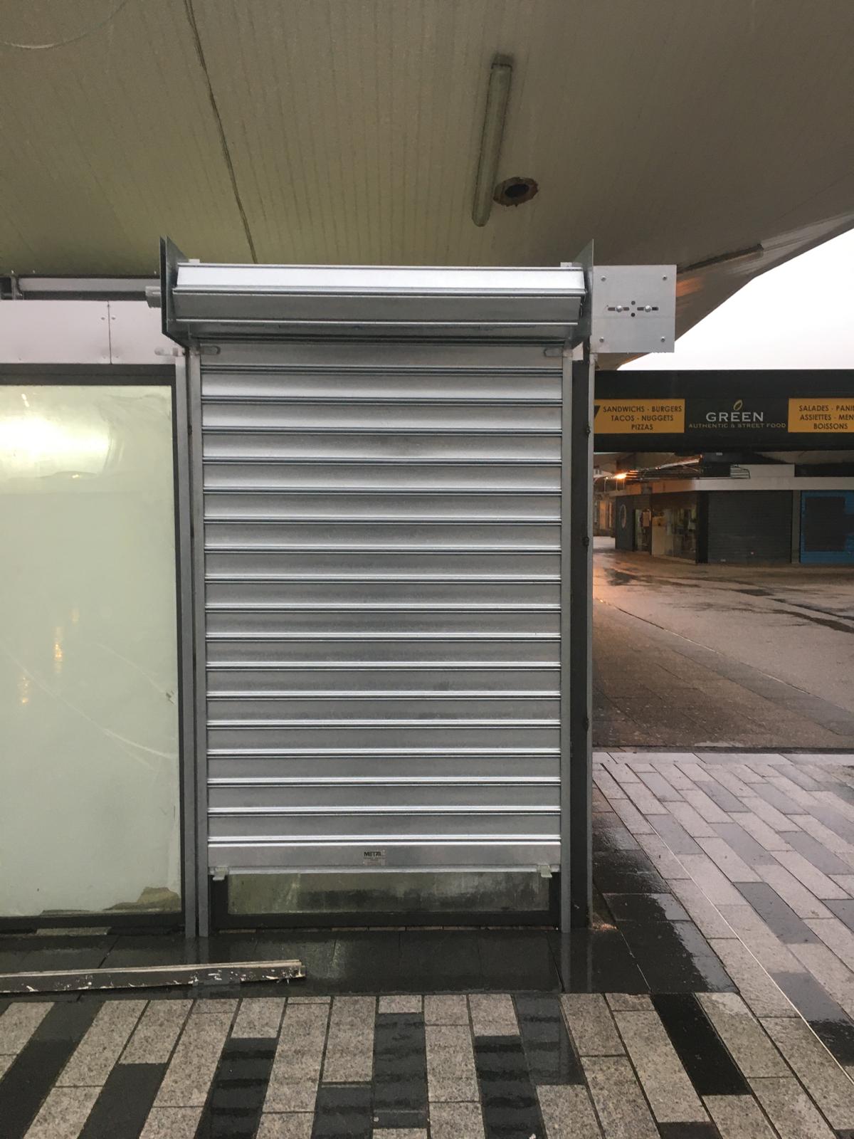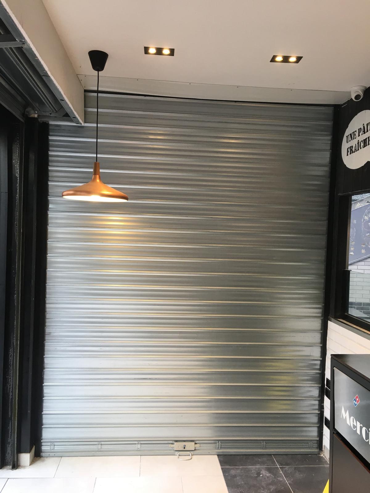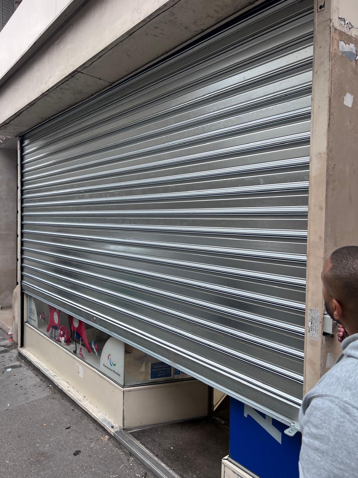 Installation de rideaux métalliques à lames pleines, idéals pour une sécurité maximale et une protection complète.