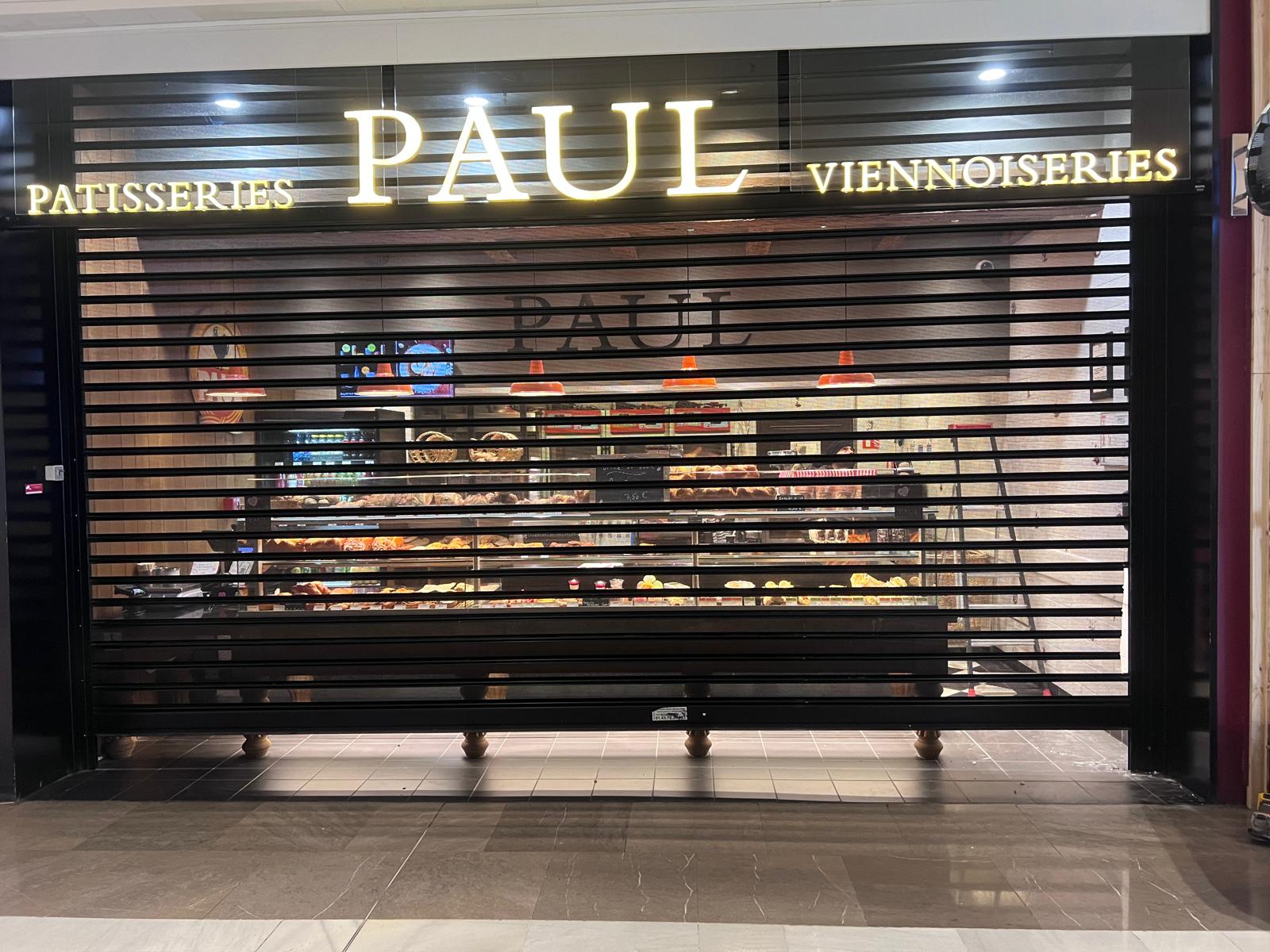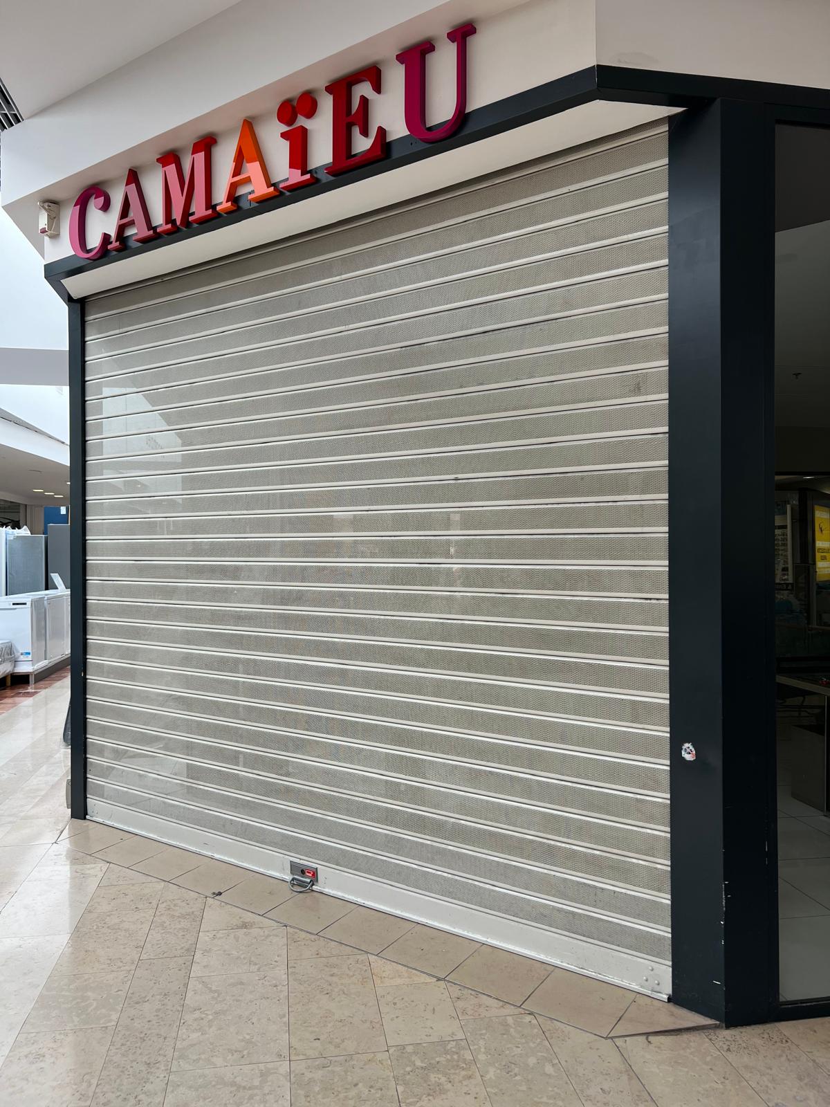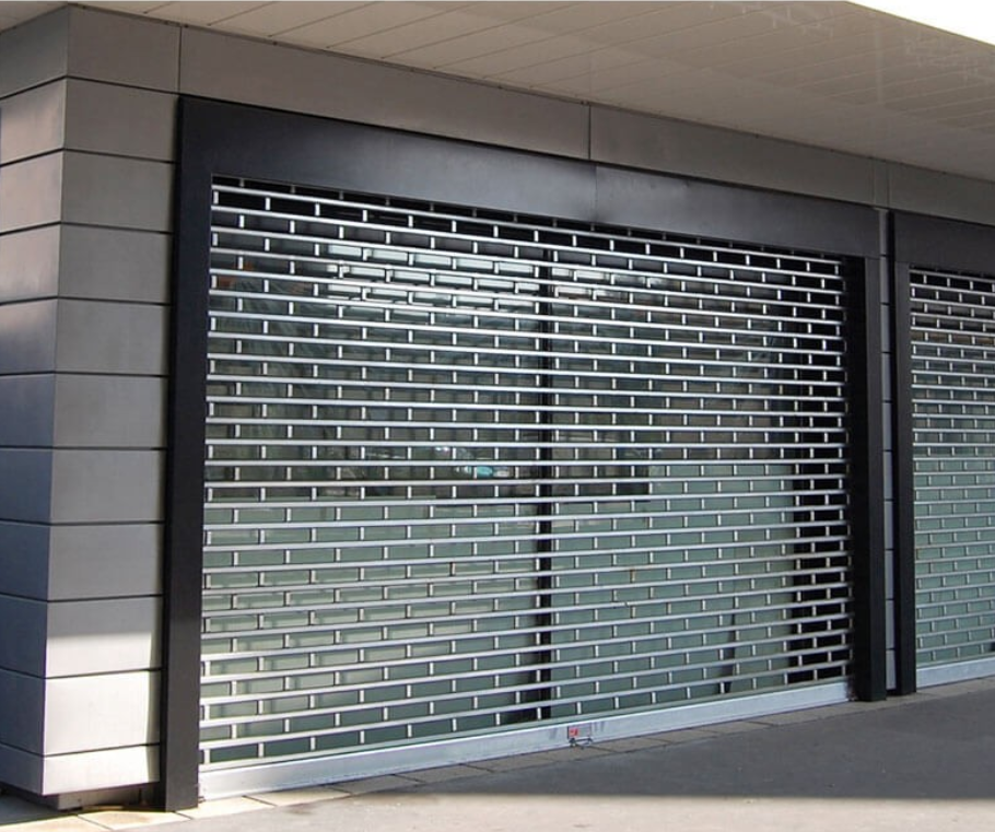Installation professionnelle de rideaux métalliques à lames transparentes, combinant design moderne et sécurité renforcée.